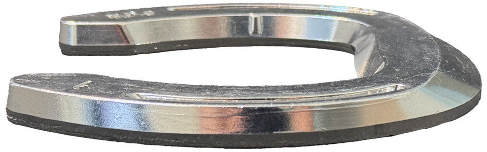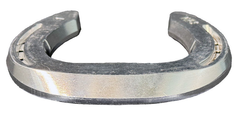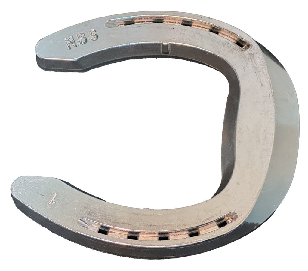 The Aluminum Natural Balance® Shoe is a wide-web, rolled toe shoe which offers maximum support to the hoof. The toe area on the foot side is seated out to eliminate sole contact beneath the tip of P-3. The toe portion of the shoe is reinforced and offers greater mass which means more material for wear. There is no wear plate in the shoe, therefore the toe can wear back as the foot grows in length. This allows the foot to stay in "Natural Balance" through the shoeing period. This feature sets the aluminum NBS aside from most steel shoes. The arched roll at the toe allows the horse easy access to his individual position for breakover. The steep shoulders of the shoe between the heels help to hold ground material in this region to provide caudal support to the frog and digital cushion.